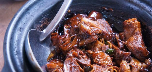 - إضافة البهارات والماء المغلي وتركه على النار إلى أن يتم نضج اللحم تماماً.