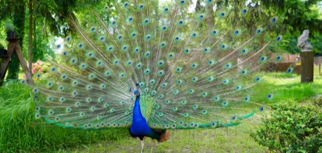 يستخدم الطاووس ذيله في موسم التزاوج، حيث يبسطه على ظهره ويُلامس الأرض من كلا الجانبين، وذلك لجذب الإناث،[٦] وقد يزن طائر الطاووس حوالي 5 كيلوغرام، ويتميز بعنقه الطويل، ومنقاره المعقوف، والساقين والقدمين الطويلة والقوية.[٩]