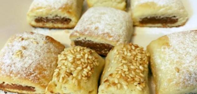 - نأخد قطعة من العجين بحجم البيضة ونفردها بشكل عرضي ونضع بداخلها التمر المشكل بحيث يتساوى طول التمر مع طريقة فرد العجين.