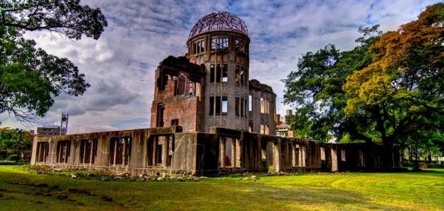 نصب هيروشيما التذكاري للسلام وهو نصيب أقيم تكريماً لحياة أولئك الذي ماتوا وفقدوا عندما أسقطت القنبلة الذرية على هيروشيما عام 1945.