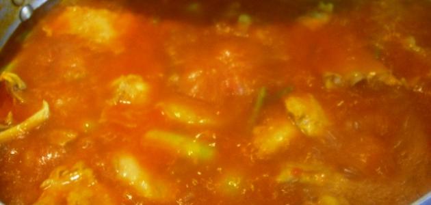 • نغمر اللحم بالماء، ونغطي القدر وننتظر مدة نصف ساعة حتى ينضج اللحم، وتتسبك الصلصة وتتكاثف.