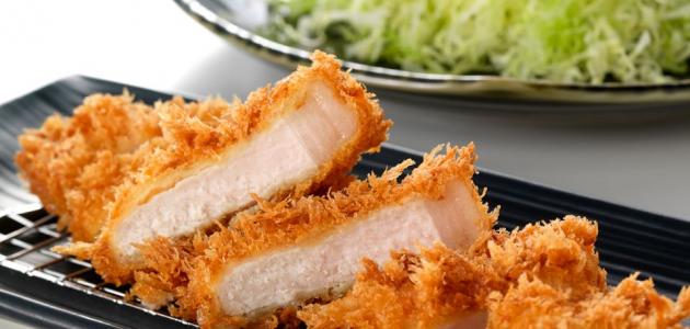 • نسخن مقلاة عميقة فيها زيت القلي على نار متوسّطة وخلال ذلك نبدأ بتتبيل قطع الدجاج، فنضع قطعة الدجاج في الطحين ونتبلها من الجانبين، ثمّ نضعها في البيض المخفوق، ثمّ نتبّلها أخيراً بالقرشلة ونضعها مباشرة في الزيت الساخن.