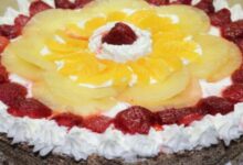 • ضعي الخوخ والكرز على الكيك، ورتّبيه على وجهِه بشكلٍ دائريّ.