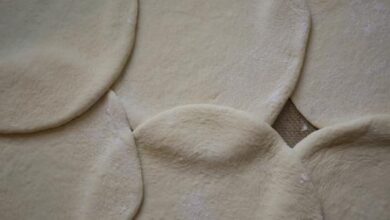 - نرش سطحاً نظيفاً ومستوياً بالطحين، ثم نقسّم العجينة لكرات ونبدأ بفردها بالشوبك لتتشكّل أقراصاً دائرية.