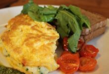 - وضع ما تبقى من الزبدة في مقلاة، وإضافة خليط البيض، وتحريكه لمدة دقيقة حتى ينضج.