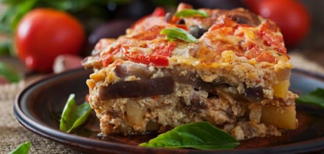 - نرتب الباذنجان المقليّ، والفلفل الحلو في صينيةّ مناسبة، ثم نضيف فوقه خليط اللحم، ثم نضع خليط اللحمة المفرومة الجاهزة.
