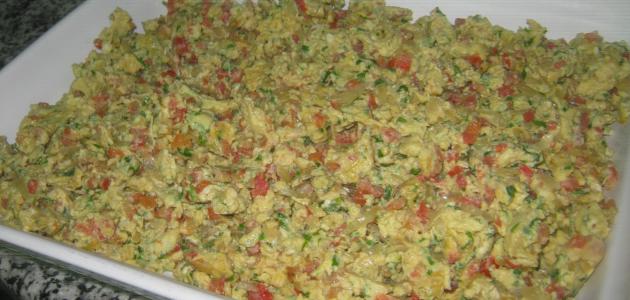 • خفق البيض جيداً باستخدام الشوكة في وعاءٍ عميقٍ، وذلك قبل إضافتها إلى مقلاة الطماطم.