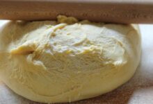 - نضيف الطحين بالتدريج، ونضيف الخميرة، ونتابع العجن على سرعة متوسطة حتى نحصل على عجينة طرية، ولا تلتصق باليد.