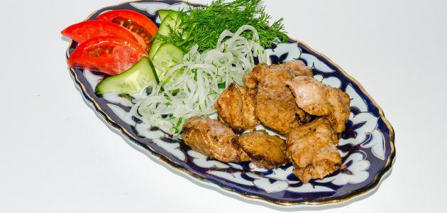 - نشكل اللحمة على شكل أصابع طويلة وسميكة، ثم تقطع إلى قطع ناعمة، ويقطع البصل إلى قطع كبيرة.