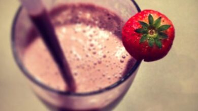 • نخرج الوعاء من الثلاجة ونصفّيه، ثمّ نضيف إليه ماء الورد والسكر، ونبرده لمدة ساعة، ثمّ نقدمه بارداً مع الثلج.