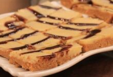• نسكب القطر فوق النمورة، ونتركها قليلاً، ثم نضع فوقها المكسرات، ونقطعها.