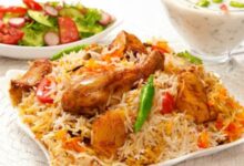 - تقديم طبق البرياني مع الدجاج.