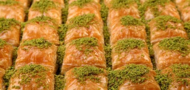 - ترتيب قطع البلقلاوة في الصينية وإدخالها إلى الفرن لما يقارب الخمس وأربعين دقيقة حتى يتحمر وجهها.