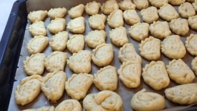 • نسكب المزيج في صينية مبطنة بورق الزبدة ومستوية السطح، وندخل الصينية في الفرن، ونتركها لمدة ثلث ساعة تقريباً، ثمّ نخرجها ونتركها حتى تبرد.