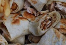 - نحضر خبز الشراك، وندهنه بملعقة من الطحينيّة، والمايونيز، ثمّ نضع فوقه المخلّلات -حسب الرغبة-، ثمّ نسكب الدجاج فوق الخبز ونلفه جيداً.