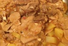 - نحضر البصل ونقطعه إلى قطع صغيرة من ثم نضعه بالوعاء ونضيف له الزيت من ثم نضع الثوم ونتركه على النار ليذبل قليلاً، من ثم نقوم بوضع اللحمة مع البصل على النار ونتركها لمدة دقيقتين.