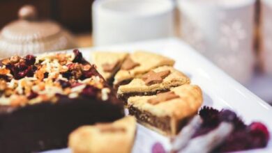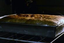 - نخرج الكيك من الفرن ونتركه جانباً حتى يبرد، ثم نقطعه ونضعه في قالب مناسب حتى يصل إلى نصف القالب.