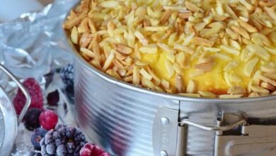 رش الكيك بملعقة كبيرة من السكر، أو وضع القالب مباشرةً في الفرن، وخبز الكيك من اثنتي عشرة إلى خمس عشرة دقيقة، أو حتى يخرج عود الخشب نظيفاً بعد إدخاله إلى منتصف قطعة الكيك.