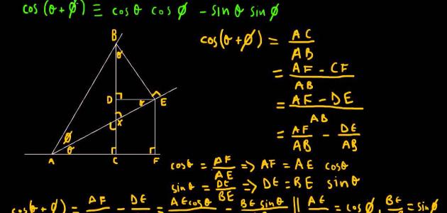 - جـ²= أ²+ب² – (2 ×أ×ب×جتا جـَ)، حيث إن: (جـَ) هي الزاوية المحصورة بين الضلعين (أ) و(ب)، والمقابلة للضلع جـ.