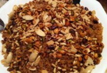 • عند التقديم يتم سكب الأرز وتزيينه بالصنوبر والفستق.
