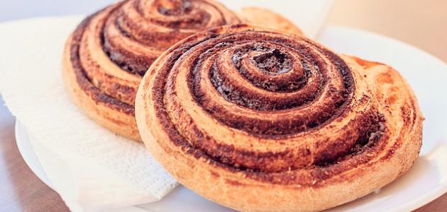 تقطيع العجينة على شكل سويس رول “لفائف” ووضعها في صواني مجهزة ومدهونة بالزبدة أو في صينية المافن وضغطها على الوجه. *رش العجينة بالقرفة والسكر والكاكاو.