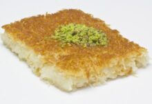 • ترك الكنافة لمدّة خمس دقائق، ثمّ قلبها في طبق التقديم، وتزيينها بالفستق المسحوق والقطر.