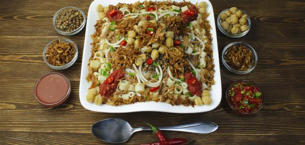 - وضع الأرز في صحن كبير مناسب للتقديم ومن ثم يوضع فوقه العدس ثم المعكرونة ثم طبقة من الحمص.