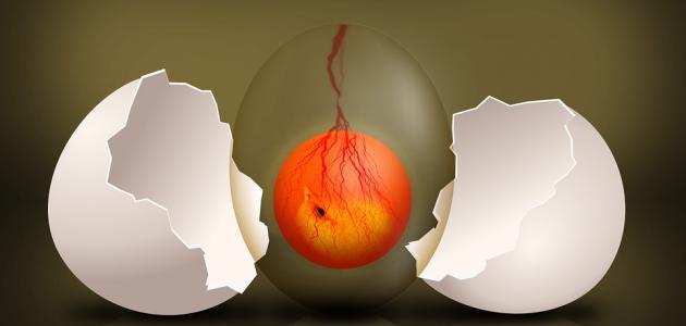 قبل وضع البيضة بيوم واحد تُخصب البويضة عن طريق اتحاد البويضة مع الحيوان المنوي، ويبدأ الجنين أحادي الخلية بالنمو حيث تنقسم الخلية إلى خليتين ثمَّ إلى أربع خلايا ثم إلى ثماني وهكذا، وعندما يحين وقت وضع البيضة تتجمع مئات الخلايا في بقعة صغيرة تسمى القرص الجرثومي، وعند الوضع يتوقف انقسام الخلايا، ومن الجدير بالذكر أنه عندما يتم تبريد البيضة لا يموت الجنين ولكنه يتوقف عن النمو، ويُمكن أن يُكمل نموه إذا رقدت عليه الدجاجة أو تم وضعه في الفقاسة.[١]