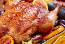 - نزيل الدجاج من المرق، مع الحرص على الاحتفاظ بالمرق جانباً، ثم نضعه في صينيّة مخصّصة للفرن مدهونة بالزيت، ثم ندخله إلى فرن متوسط الحرارة لمدة عشرين دقيقة أو حتّى يحمر.