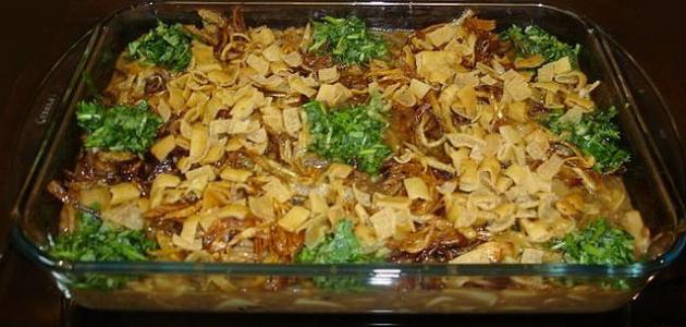 - نسكب خليط العدس والمعكرونة في طبق بايركس، ونزيّن وجهه بالسماق، والبصل المقلي، والثوم المهروس، والقليل من زيت الزيتون، والخبز المقلي.
