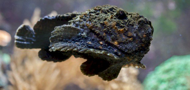 يظهر شكل السمك الحجري (بالإنجليزية:Stonefish) وكأنه صخرة أو قطعة من المرجان وهو شكل من أشكال التمويه بهدف حمايته من الحيوانات المفترسة، وهو نوع من أنواع الأسماك الخطيرة التي تقوم بمهاجمة أقدام الناس من الأسفل.[٢]