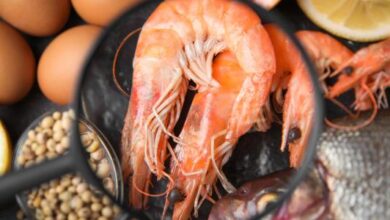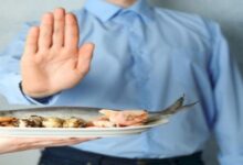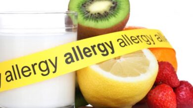 - حساسية الطعام: تظهر حساسية الطعام عند تفاعل الجهاز المناعي بطريقة غير صحيحة مع أنواعاً معينة من المواد المتواجدة في الأطعمة أو المشروبات، وتظهر أعراض الحساسية بعد تناول الطعام بفترة تتراوح ما بين بضع دقائق إلى عدة ساعات، ومن هذه الأعراض: الشعور بالحكة في العينين، والطفح الجلدي، والتّورّم، وتشنّجات المعدة، والغثيان، والتقيؤ، وربما المعاناة من ضيق التنفس كذلك. ومن أكثر المواد التي عُرفت بتسببها بالحساسية: الفول السوداني وفول الصويا وحليب البقر والبيض والسمك[٢]