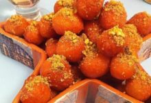 - نحضر الصينيّة من الفرن ويُسكب عليها القطر.
