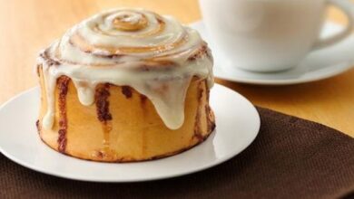 • وضع فطيرة السينابون على طبق اللتقديم، وتزيينها بصلصة السكر.