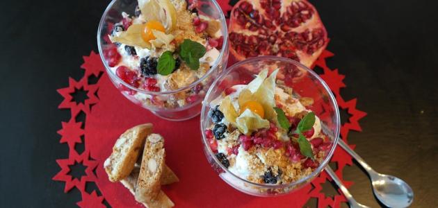 • نُجهّز أكواب التّقديم؛ حيث نضع ملعقة كبيرة من الفواكه المشكّلة -دون عصيرها- في قاع كلّ كوب، ثمّ نضيف ملعقتين كبيرتين من الكريمة فوق الفواكه في كلّ كوب.