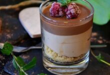 إذابة قطع الشوكولاتة مع الدهن النباتي في مقلاة صغيرة على نار هادئة، أثناء خبز قطع التورتيلا.