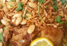 • سكب الأرز في طبق التقديم ووضع الدجاج المحمر فوقه.