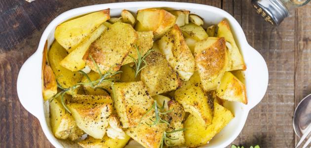 وضع شرائح البطاطس في طبقٍ زجاجي مناسب للفرن وتركها جانباً.