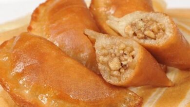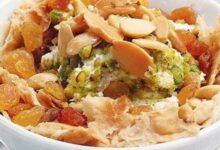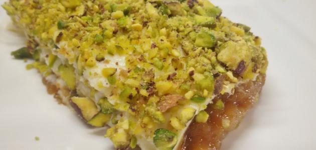 • نوزع كمية وافرة من المكسرات، والفستق الحلبي المجروش على السطح، ونشربها بالقطر البارد ثم تقدم.