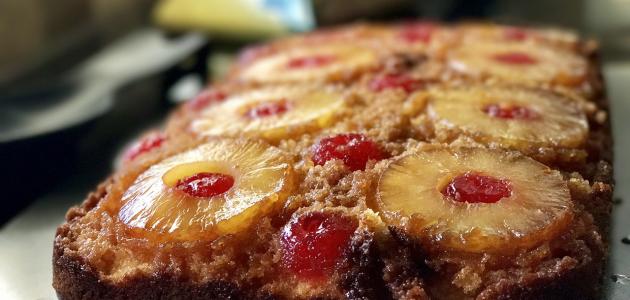 • إخراج صينية كيك الأناناس من الفرن وقلبها مباشرة في طبق التقديم دون إزالة القالب لمدة خمس دقائق ثم إزالة القالب وترك الكيك حتى يبرد.