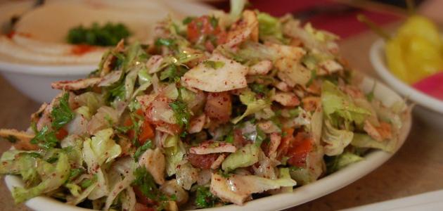 • وضع السلطة في وعاء تقديم مناسب ووضع الخبز المحمّص فوق الفتوش ورش الفتوش بالسماق وسكب الصلصة على وجهه وتقديمها.