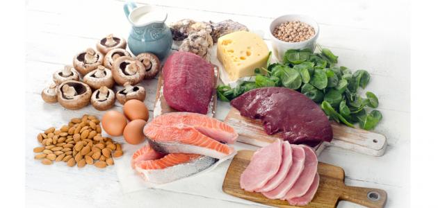 • الأسماك، واللحوم، والدواجن، مثل: الديك الرومي، والدجاج، واللحم البقري، والكلية، والكبد.