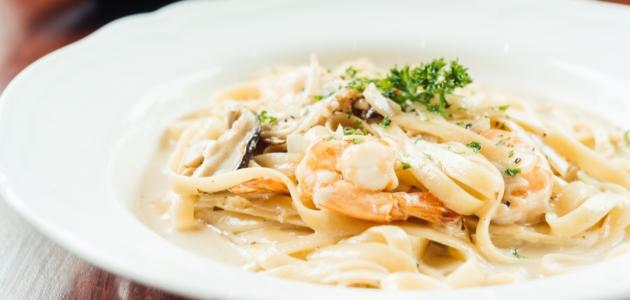 تصفية المعكرونة وإضافتها على الرّوبيان والتّقليب إلى أن تختلط المواد ثمّ سكبها للتقديم ونثر البقدونس وتقديمها مباشرة.