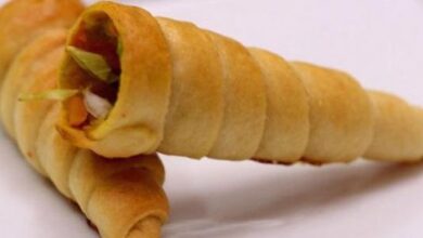 - وزّعي ملعقةً من الحشوة على كلّ مستطيل، ولفّي العجينة على شكل رول مغلق من الطّرفين، وثبّتي الأطراف بلاصق العجين (الماء والدّقيق).