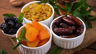 • الفواكه المُجفّفة: مثل المشمش، والتين، والخوخ، والزبيب، وتجدر الإشارة أنّ من الأفضل البحث عن أنواع الفواكه المُجفّفة غير المحلاة لتجنّب السكر المضاف.