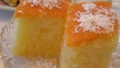 - تُخرج النمورة من الفرن، ويُسكب عليها القطر فوراً.