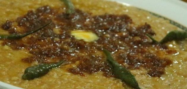 • عند نضج الجريش يتم سكبه في الطبق المخصص لذلك، ومن ثم رشّ البصلة المحمرة مسبقاً على وجه الطبق.
