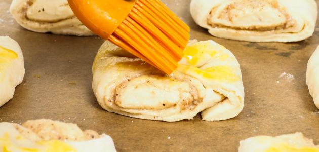 - ندهن المعجّنات بكميّة من الزبدة المذابة مع القليل من الحليب السائل، ويُفضّل أن يكون الحليب كامل الدسم.