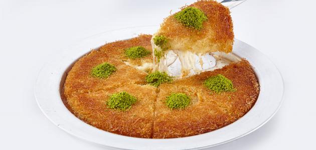 • توزيع الفستق الحلبي على الكنافة ثمّ تقطيعها وتقديمها ساخنة.