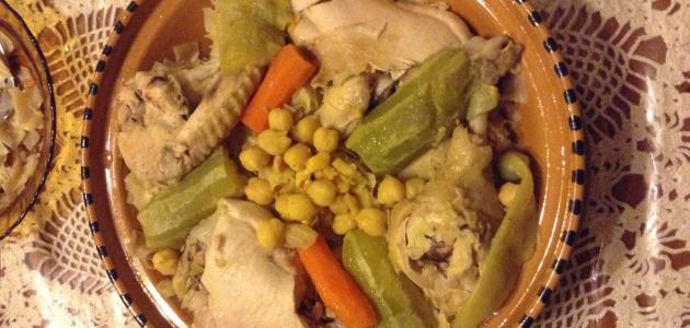 • تسخين الزيت في قدر كبير الحجم على نار متوسطة ثمّ تقليب الدجاج مع الخضار، والبهارات (عدا الكسكس، والكوسا) قليلاً ثمّ خفض الحراراة وترك الخليط على النار الهادئة لمدّة من عشر دقائق إلى خمس عشرة دقيقة من التحريك من وقت لآخر دون إضافة الماء.